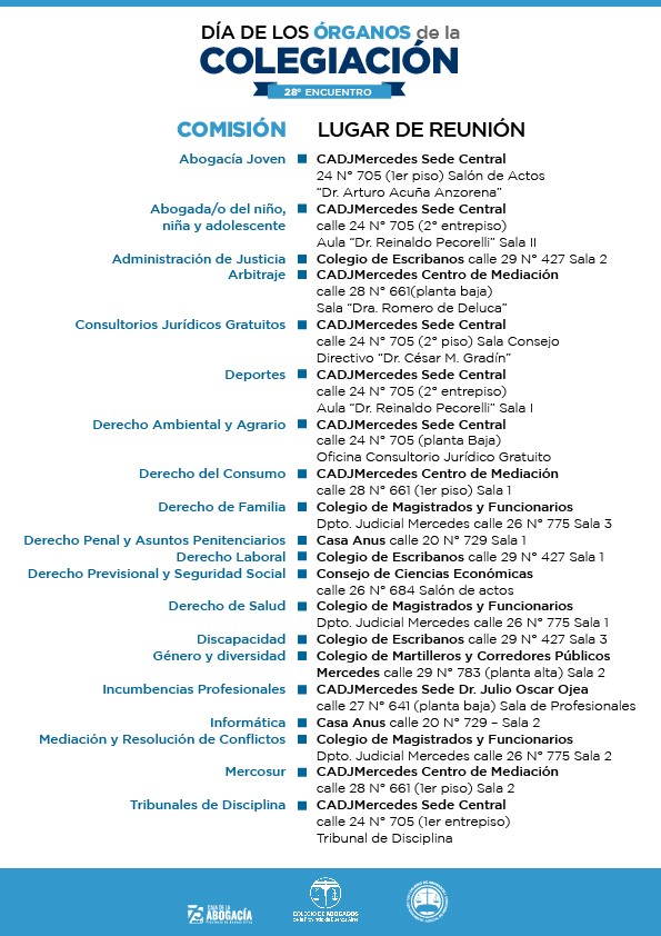 El 24 y 25 de agosto se llevará a cabo en la ciudad de Mercedes la tradicional reunión por el “Día de los Órganos de la Colegiación”, que viene realizándose desde el año 1994 en el Colegio de Abogados del Departamento Judicial de Mercedes, reeditándose así este encuentro nacido por inspiración del entonces Presidente del Colegio, Dr. Cesar Manuel Gradín